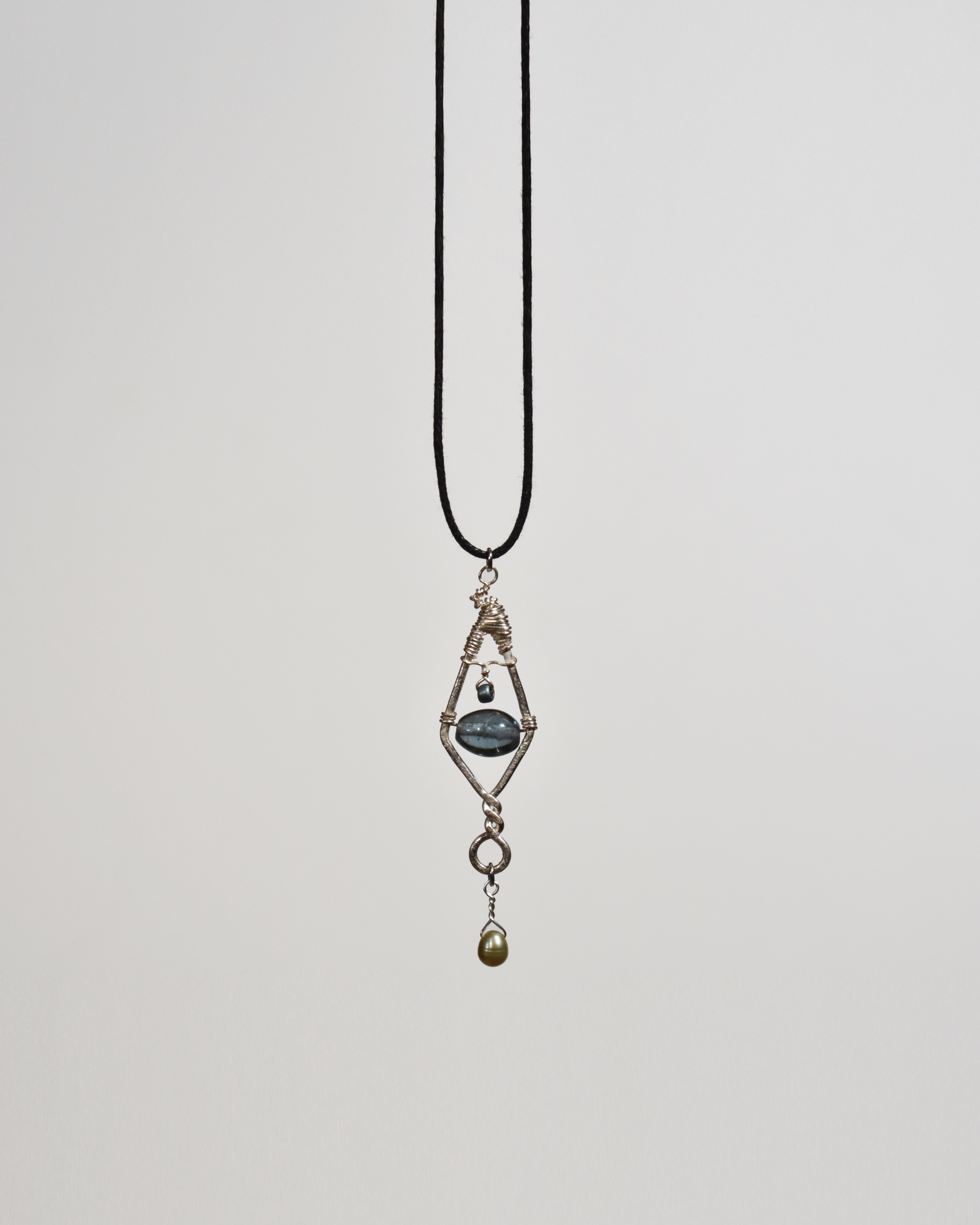 The Selkie Necklace references the often non-linear, interwoven geometric designs of ancient Celtic knotwork. The pendant features shaped and hammered silver and is strung upon a cotton cloth cord. A small, irridescent bead is strung through silver wire, which is wrapped around the top portion of the pendant. The piece is completed with a glass bead fastened in the very center and a dangling freshwater pearl.